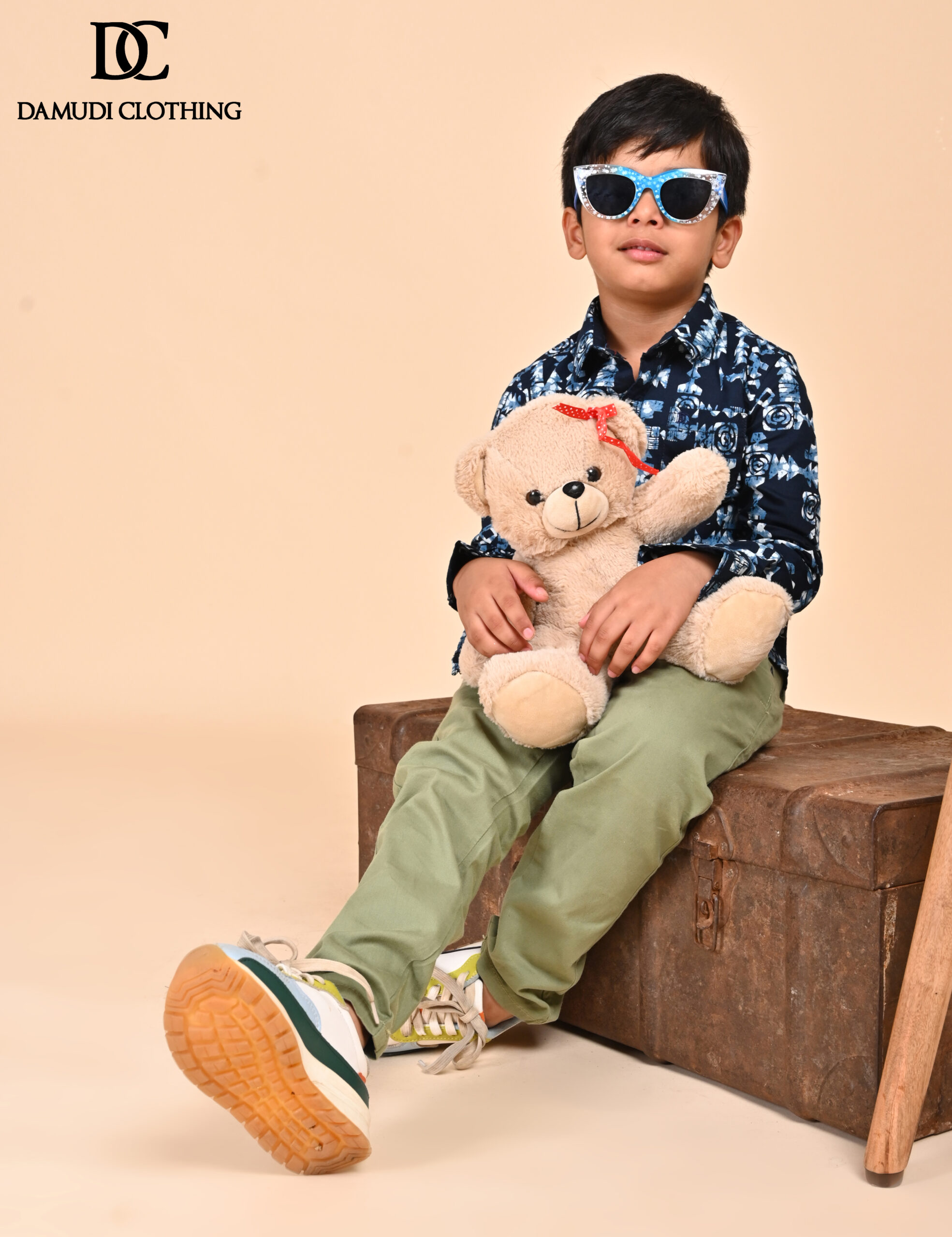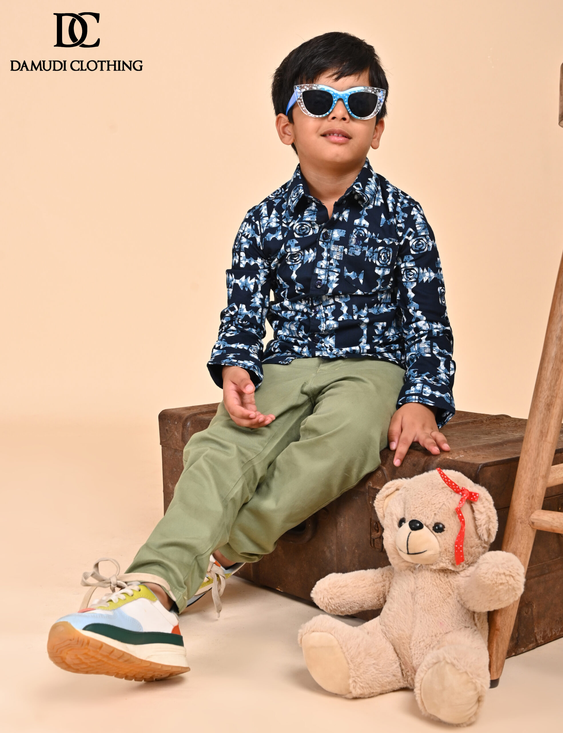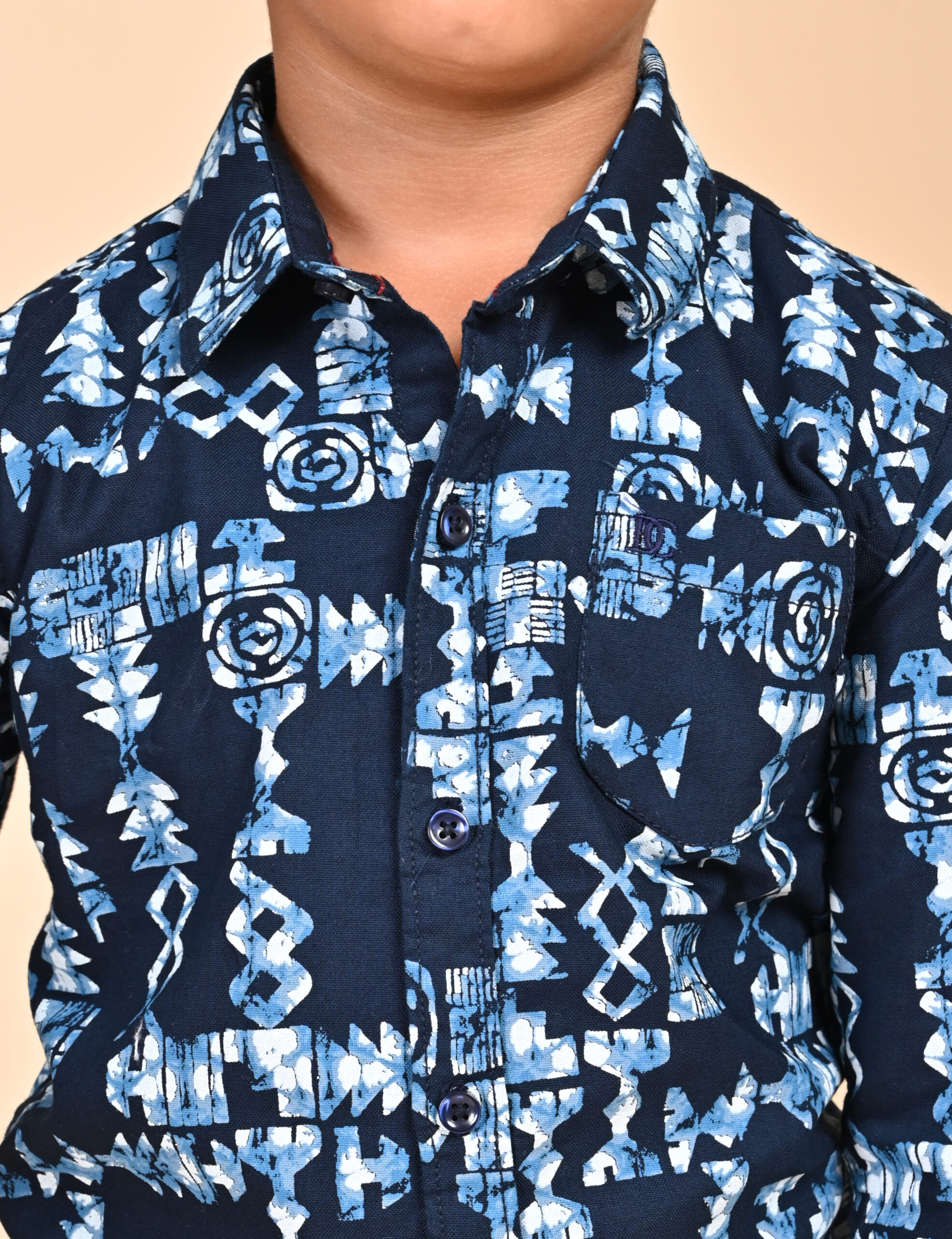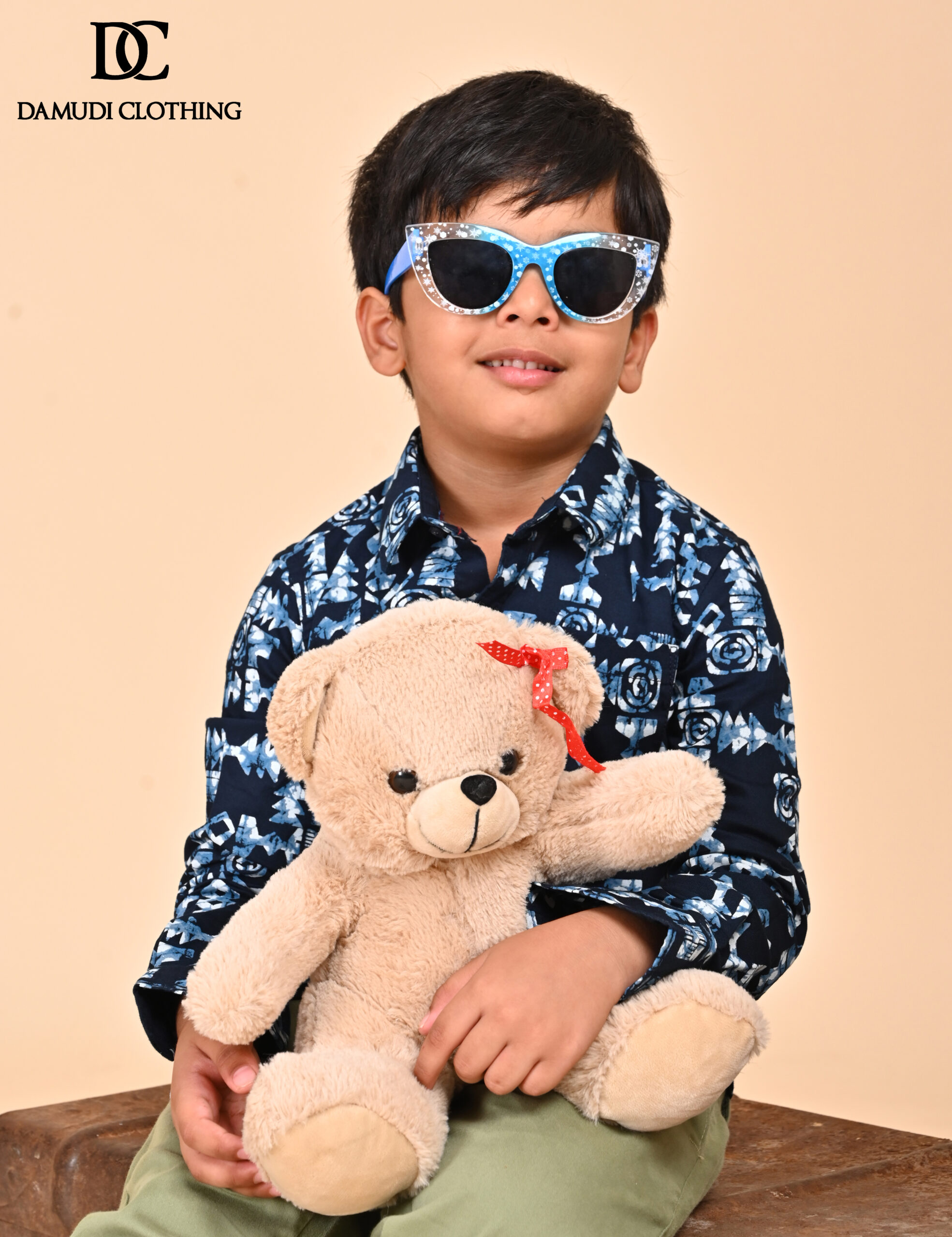 Navy blue floral patterned shirt for boys. Soft cotton, button-up design, and geometric accents. Ideal for catalog styling and casual wear.