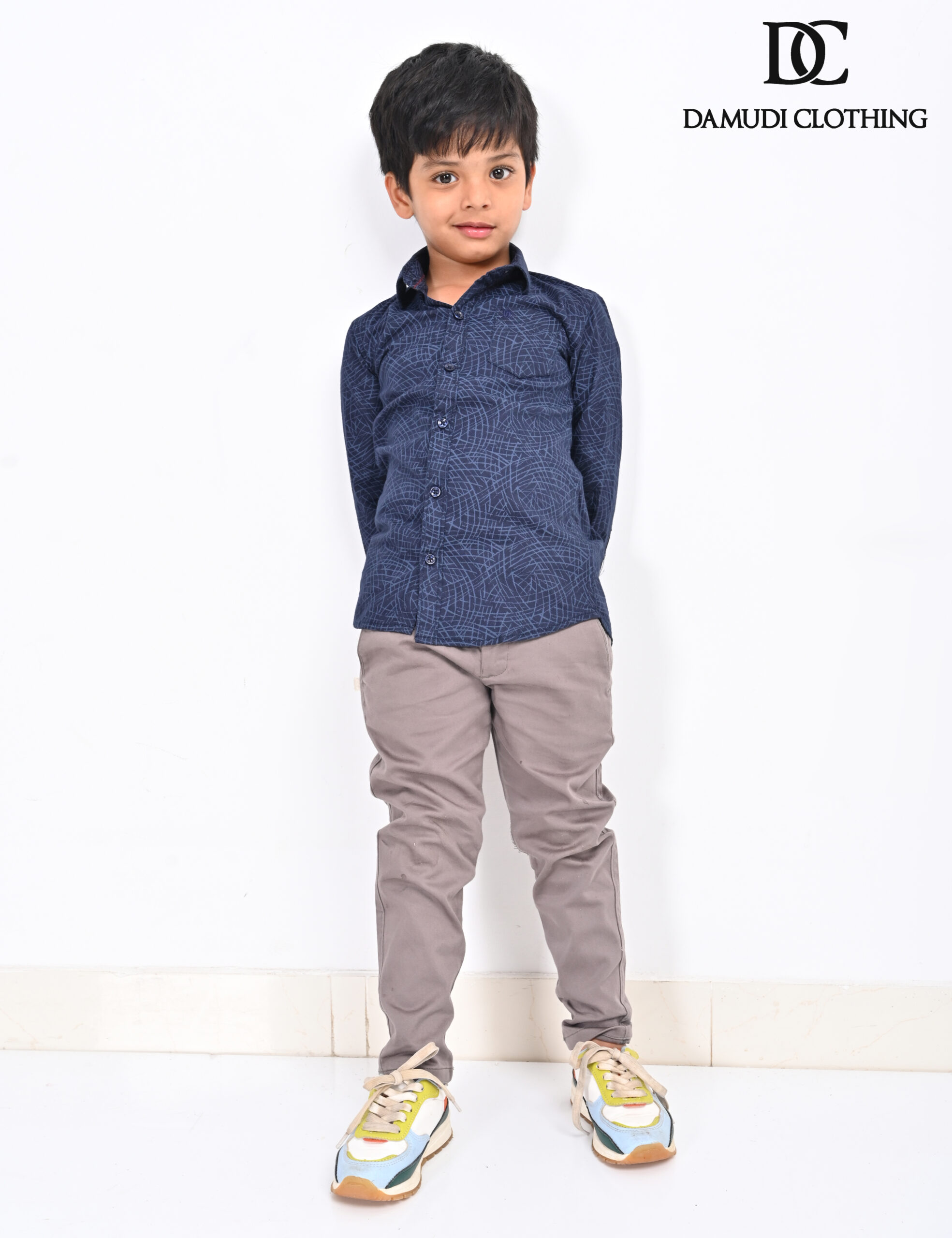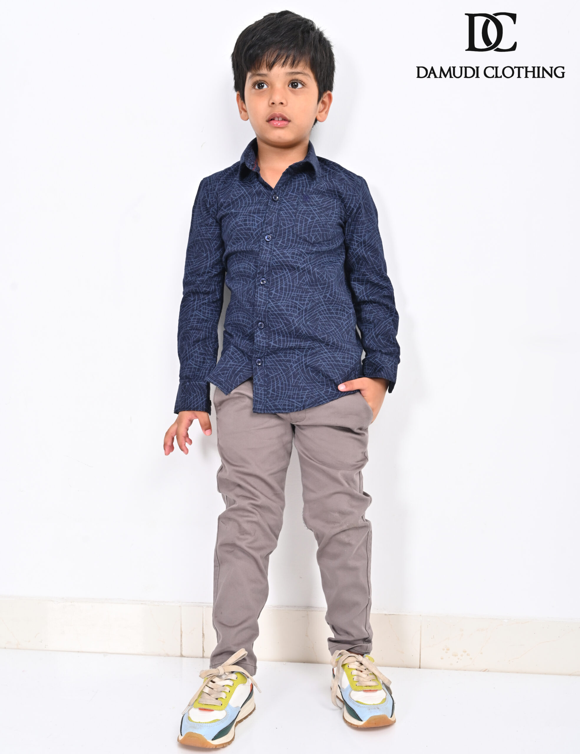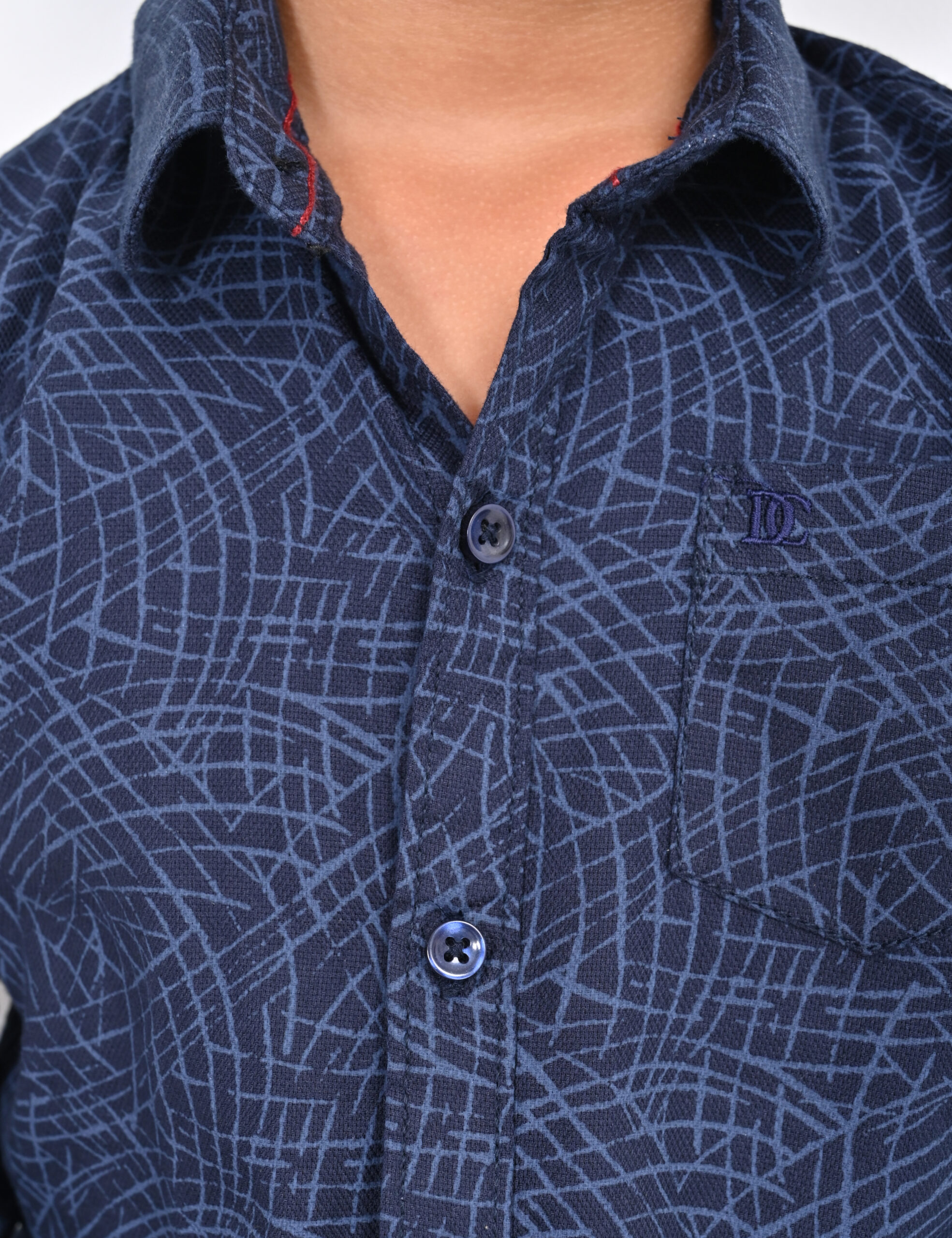 Dark blue geometric shirt for boys. Lightweight cotton, button-up design, and maze-like pattern. Perfect for everyday wear and catalog styling.