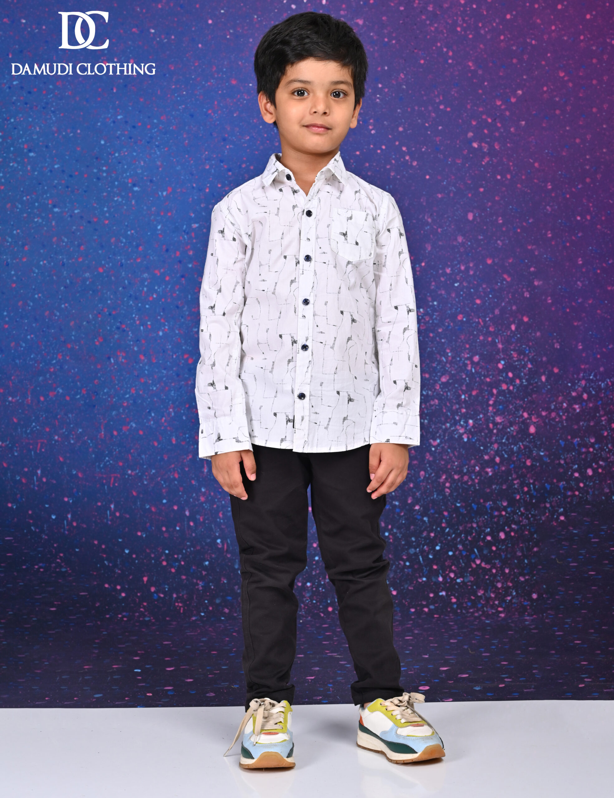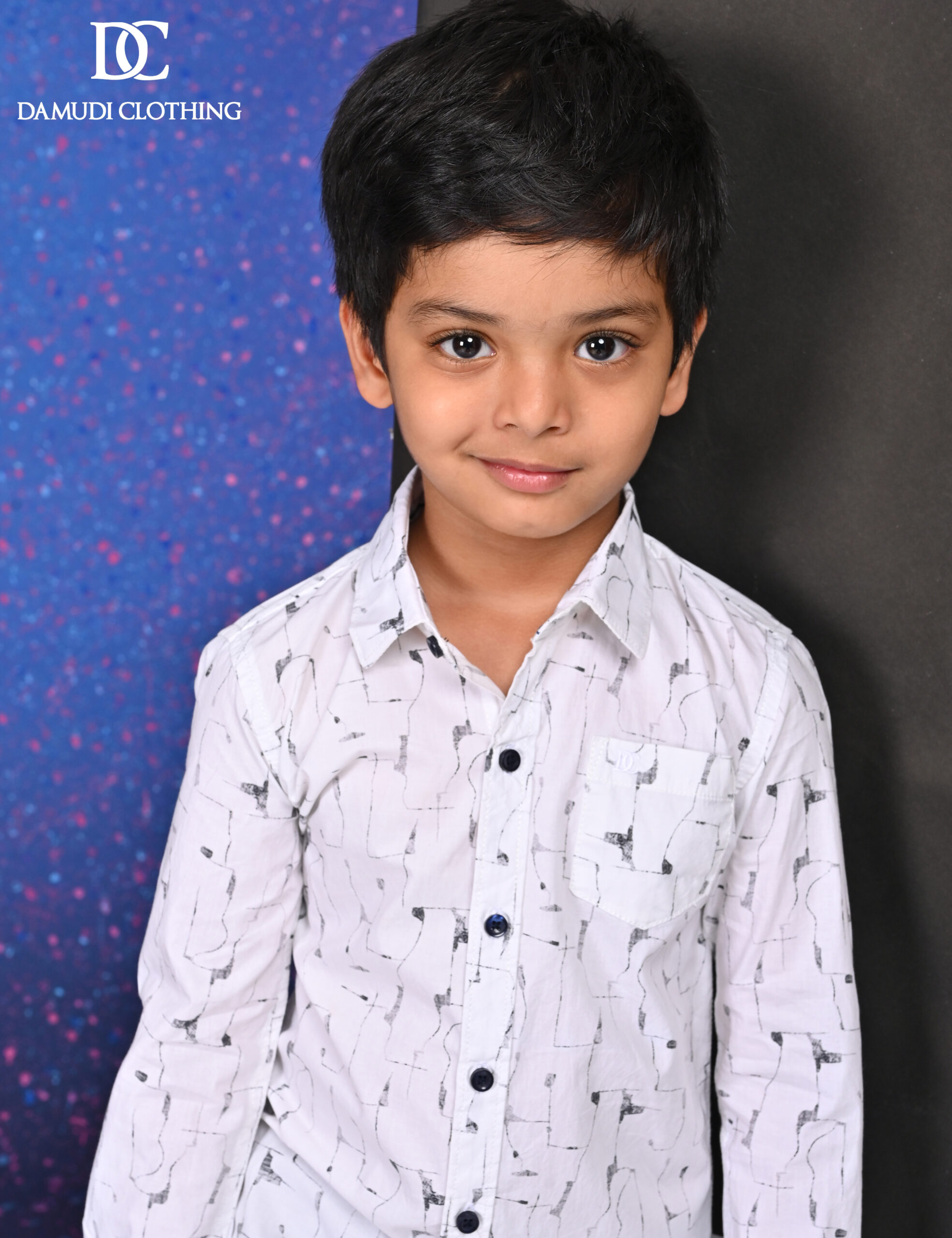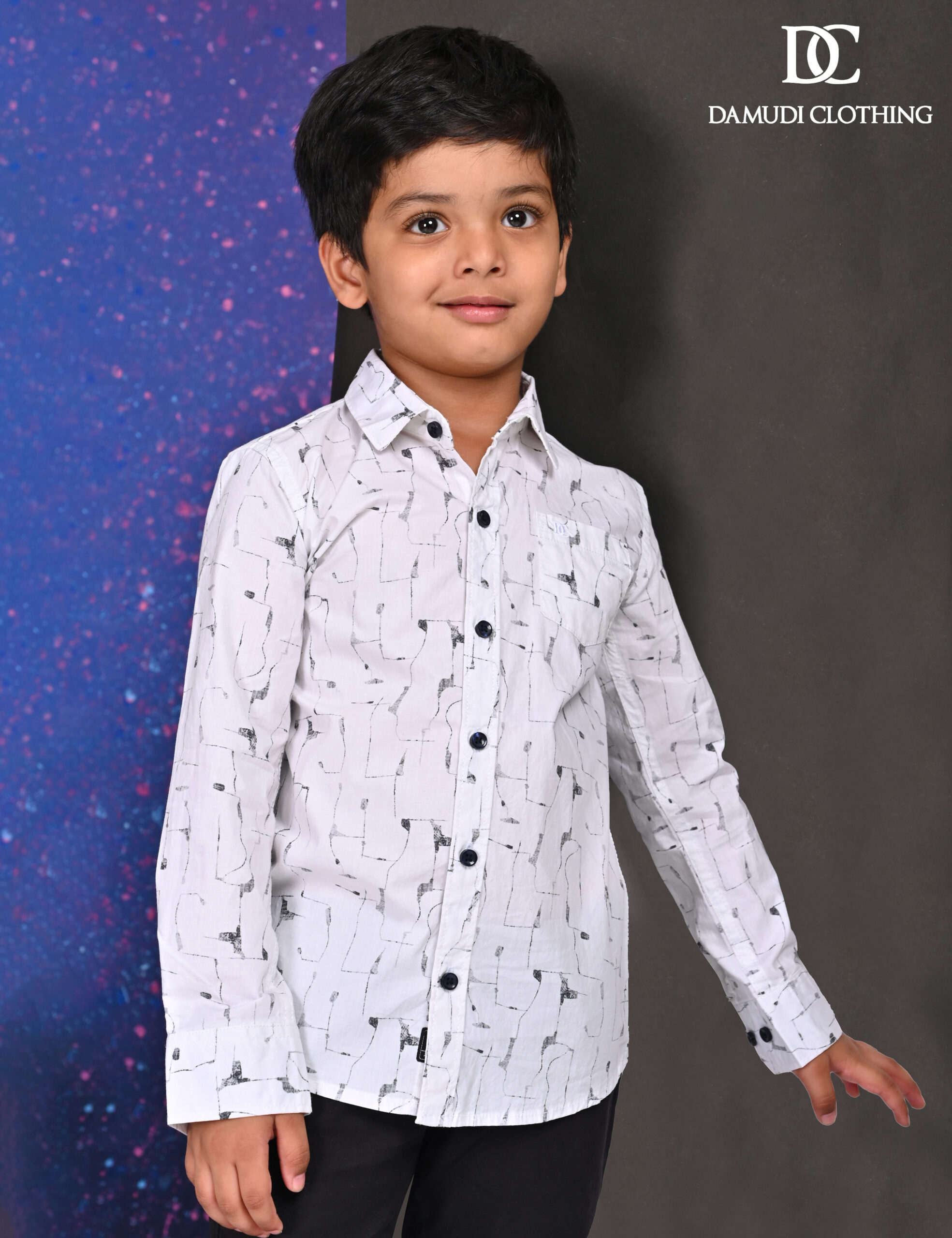White abstract patterned shirt for boys. Soft cotton, button-up design, and bold styling. Ideal for catalog shoots and casual wear.