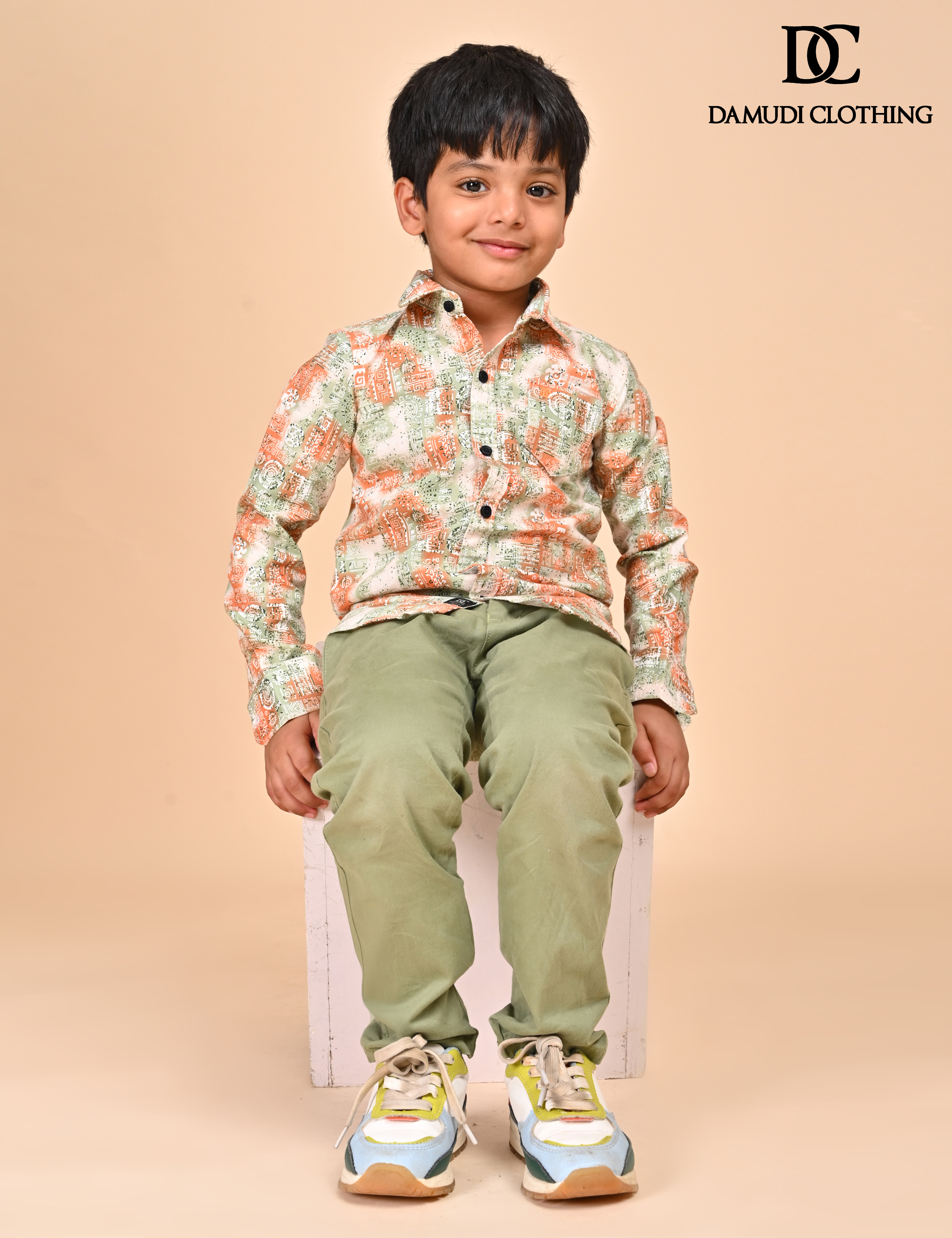 Vibrant patterned shirt for boys in orange, green, and white. Soft cotton, button-up design, and cheerful styling. Ideal for catalog shoots and casual wear.