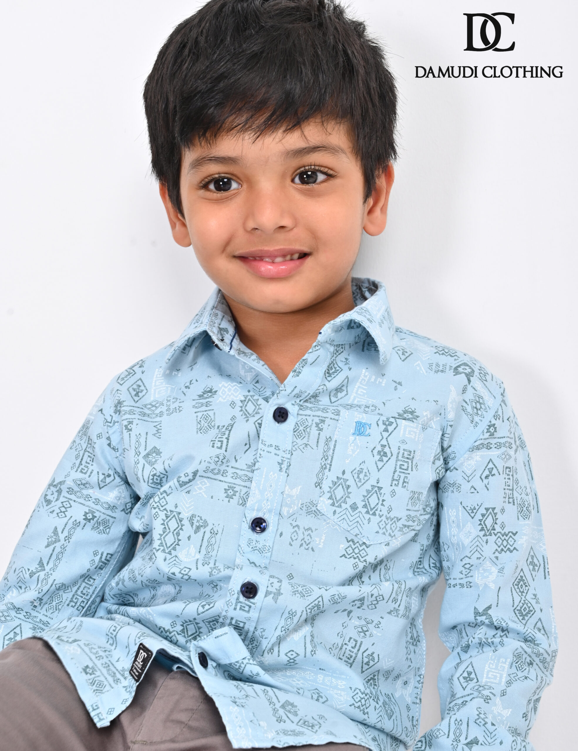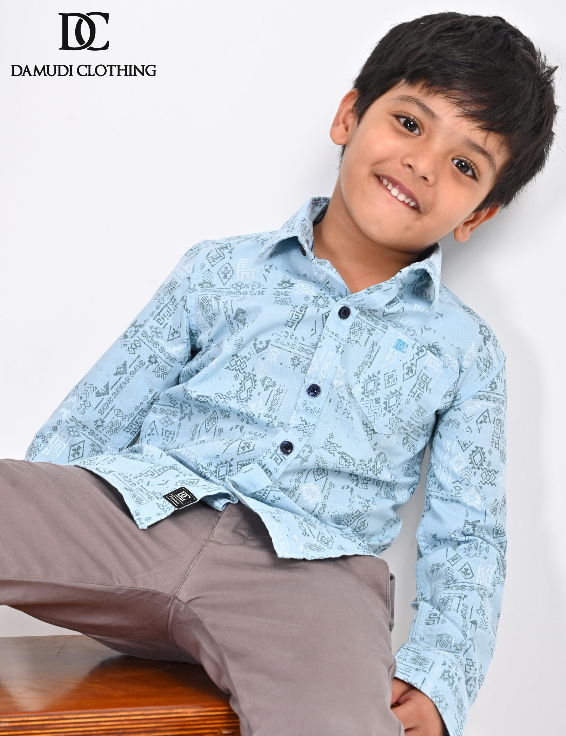 Light blue tribal pattern shirt for boys. Soft cotton, button-up design, and geometric print. Ideal for catalog shoots and casual wear.